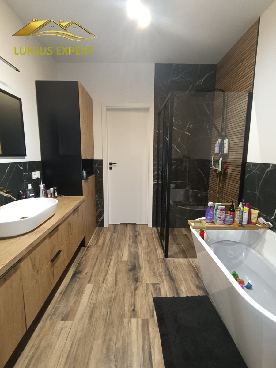 W łazience znajduje się wolnostojąca wanna, prysznic, WC- podwieszany geberit, umywalka nablatowa oraz meble w zabudowie.
